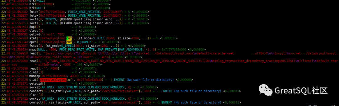 strace -T -tt -s 200 -o strace_cnf.log mysql --defaults-file=/data/mysql/my.cnf在对比两个 strace 日志的时候,发现如下区别 strace_socket.log 日志中,登录过程依次尝试打开文件