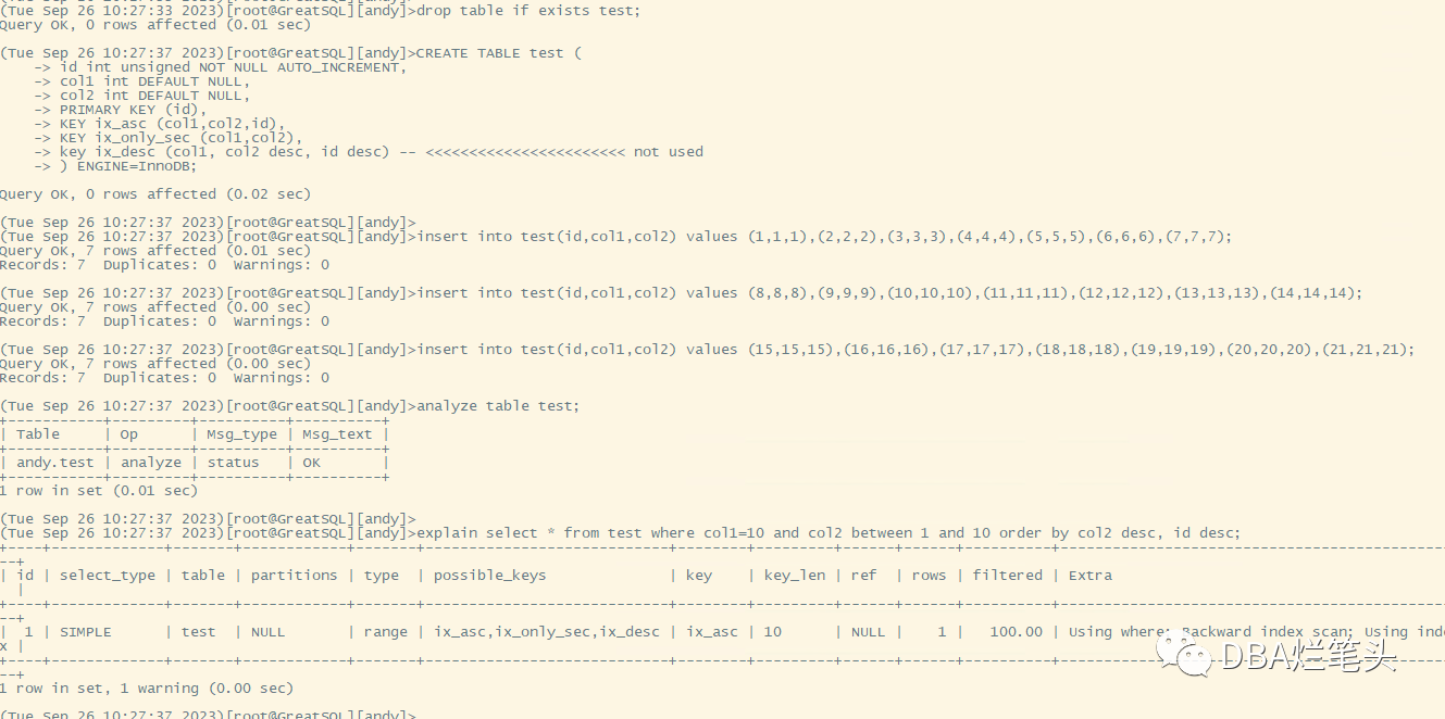 (Tue Sep 26 10:27:37 2023)[root@GreatSQL][andy]>CREATE TABLE test (