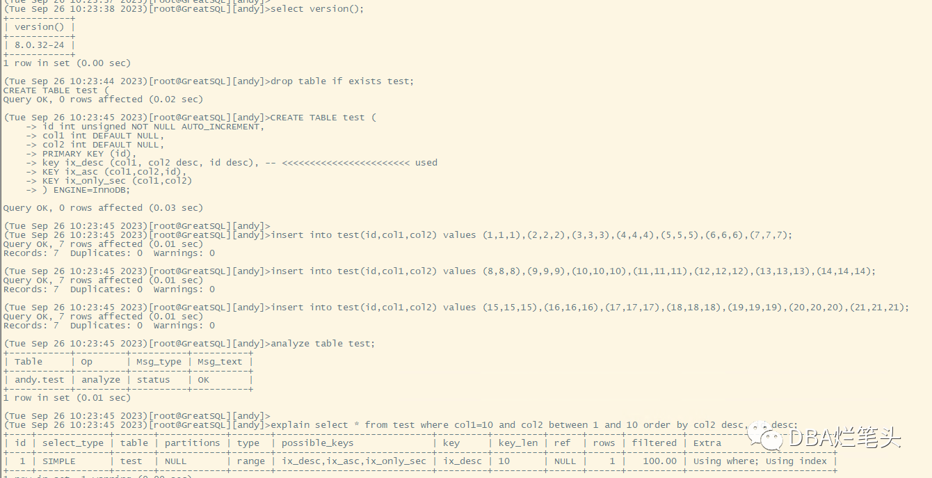 (Tue Sep 26 10:27:37 2023)[root@GreatSQL][andy]>explain select * from test where col1=10 and col2 between 1 and 10 order by col2 desc, id desc;